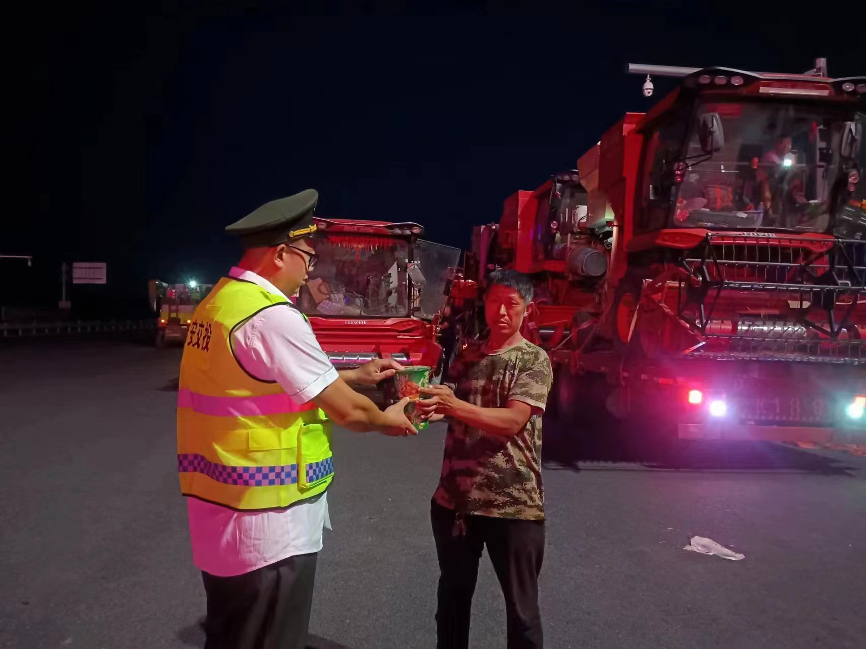 京德南区文安西收费站收费一班为“三夏跨区作业车辆”送上泡面、矿泉水、毛巾、肥皂等便民物资,并提醒他们...